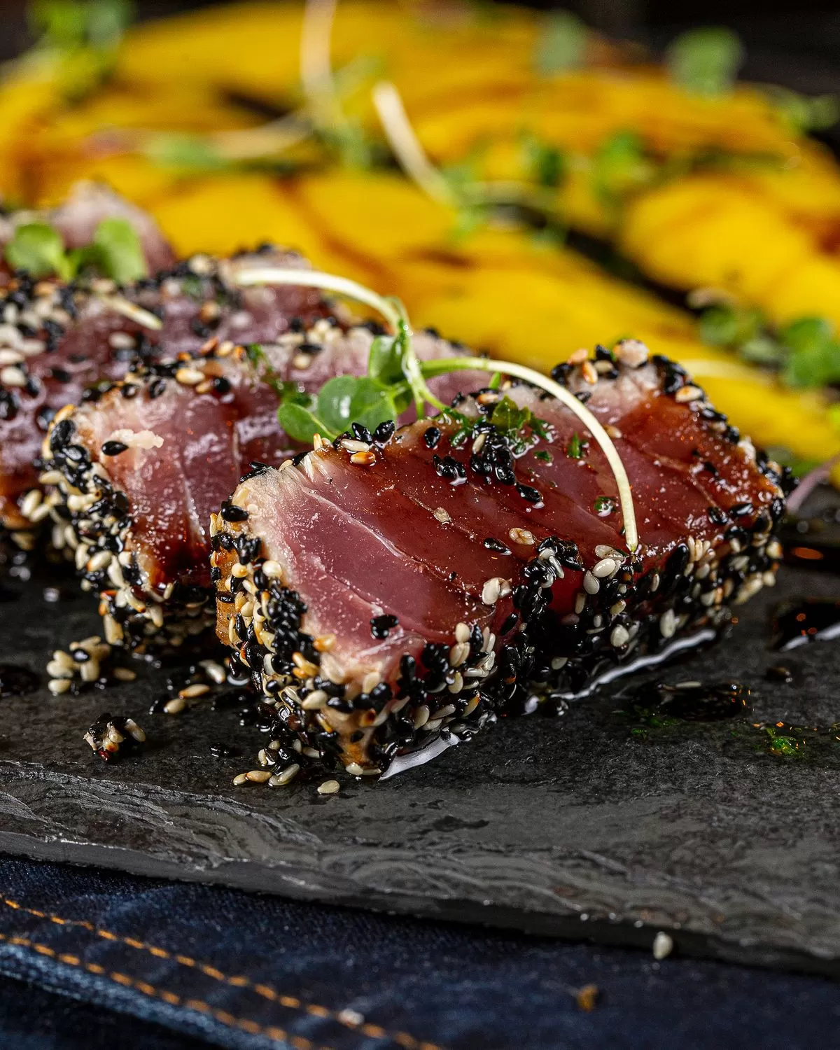 Seared Tuna Tataki – Sesame Crust, Avocado Puree, Soy-Citrus Dressing