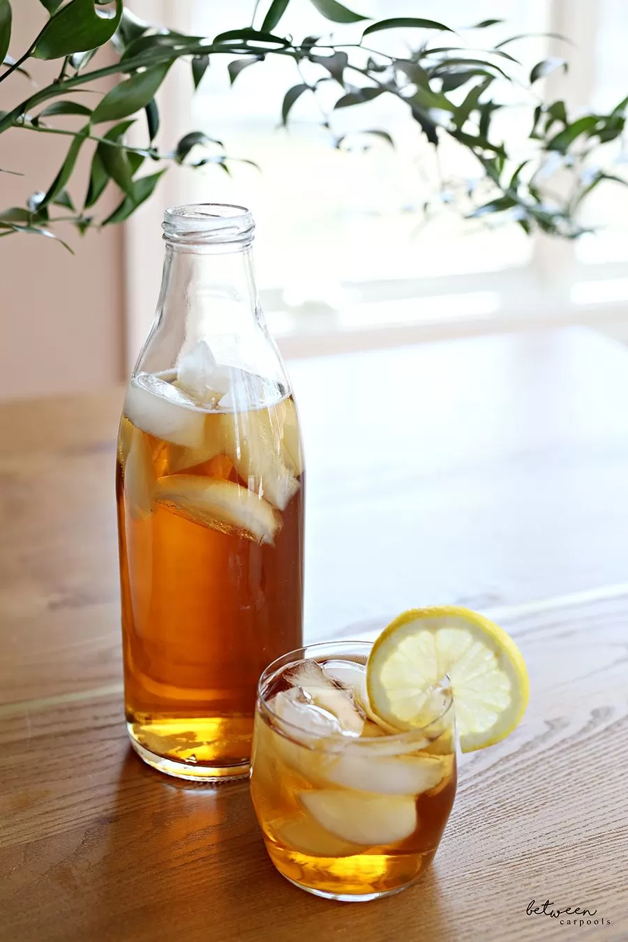 Creamy tagliatelle pasta served with breaded crispy chicken and parmesan flakes, accompanied by a refreshing homemade iced tea.
