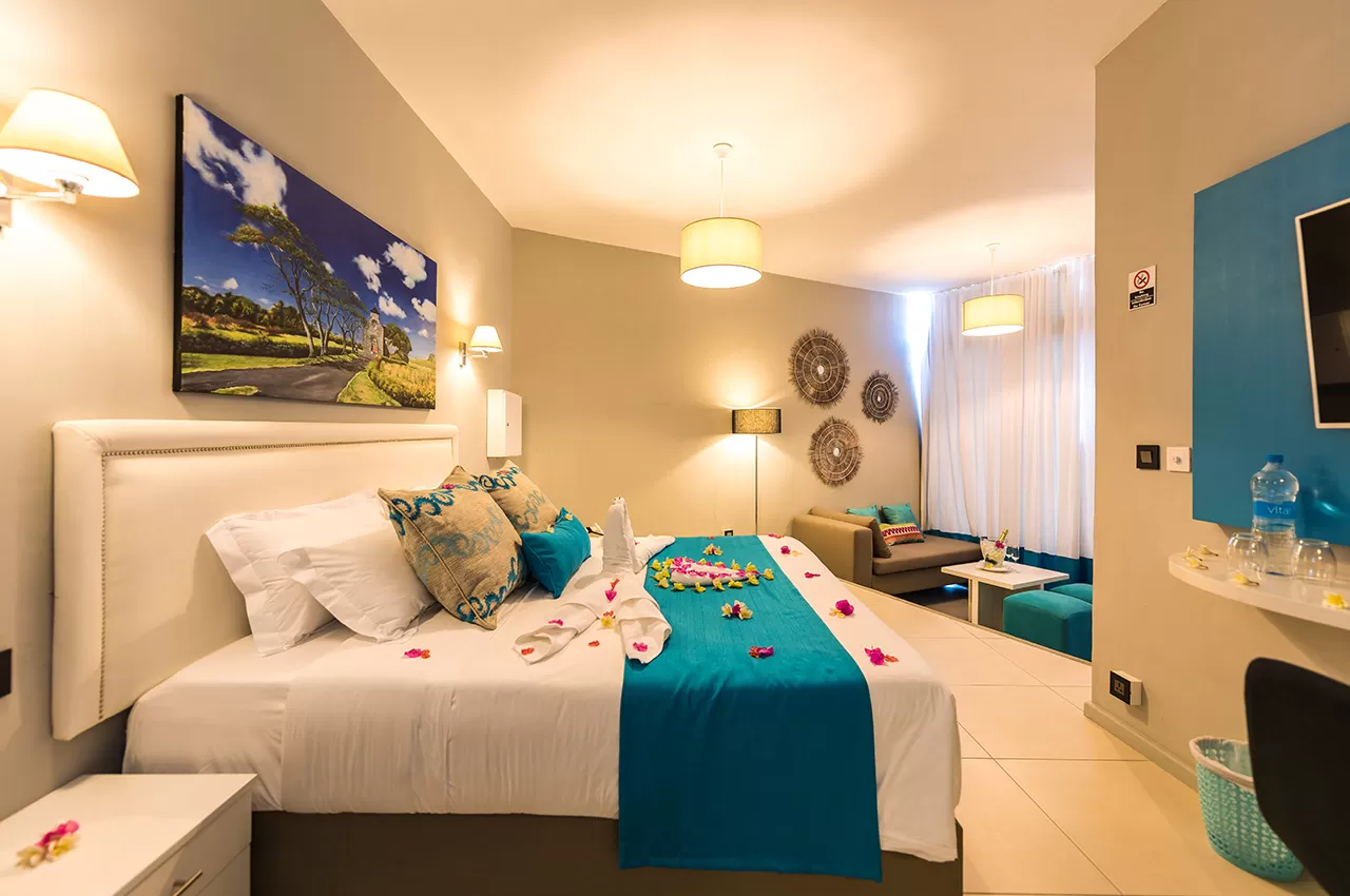 Set in the heart of Grand Baie, Azur Paradise Hotel blends boutique comfort with rooftop vibes. Book a Deluxe Room and choose your preferred meal plan — Bed & Breakfast or Half‑Board with Standard and Premium options. You’ll enjoy swimming pool access (bring your own towel), access to the Moods Skybar Restaurant, free Wi‑Fi, and daily housekeeping services.